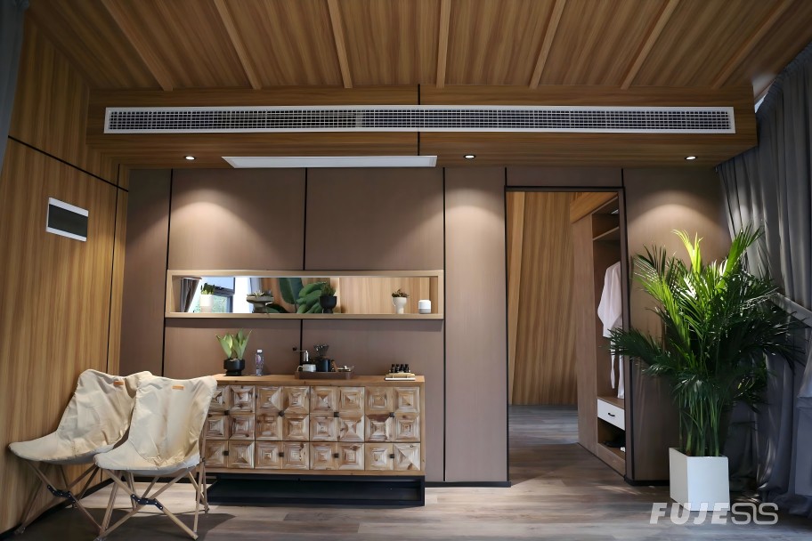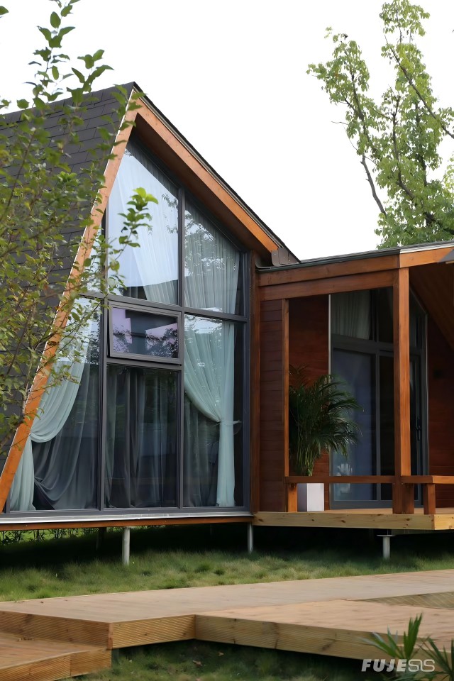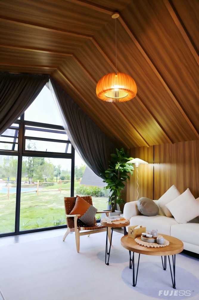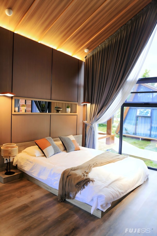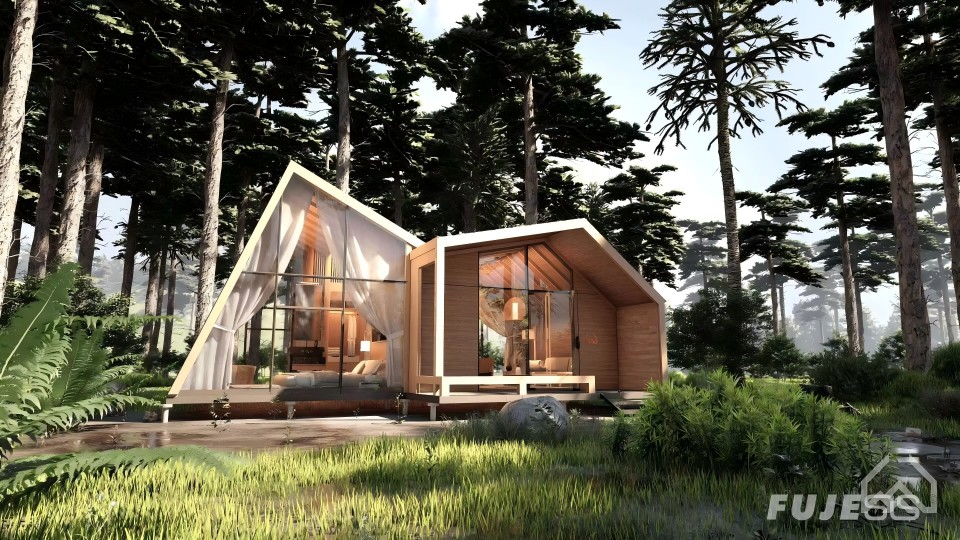 森旅木屋是一种所想即所得的装配式木屋,适合全年龄段人群精致野奢度假,室内外功能齐全,让设计美学充盈视觉,让空间彰显舒适。该产品整体面积大约65㎡,主要包含客厅和卧室。